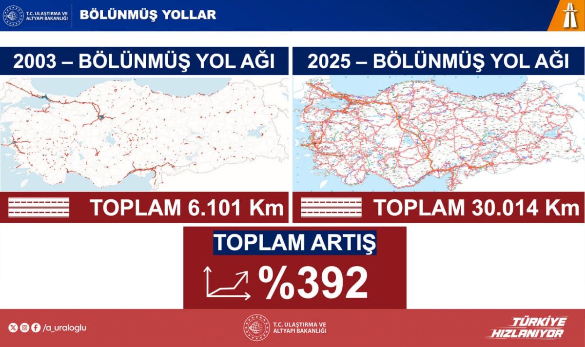 Bunun yaklaşık 180 milyar dolarını karayollarına harcadık. 2002’de 6 bin 101 kilometre olan bölünmüş yol ağımızı 30 bin 14 kilometreye çıkardık. 8 bin 591 kilometre olan Bitümlü Sıcak Karışımlı yol ağımızı 32 bin 708 kilometreye yükselttik.