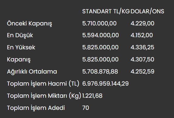 KMKTP’de altında toplam işlem hacmi 6 milyar 976 milyon 959 bin 144,29 lira, işlem miktarı ise 1221,68 kilogram oldu.