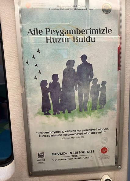 Diyanet İşleri Başkanlığı, “Mevlid-i Nebi Haftası” kapsamında çeşitli illerde afişler hazırlayarak yayınladı. Ankara metrosunda da görülen afişte, “Aile Peygamberimizle Huzur Buldu” ifadelerinin altında anne, baba ve dört çocuktan oluşan bir ailenin gölgesi yer aldı.