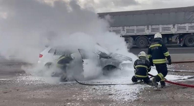 Aksaray’da gerçekleşen olay, saat 12.30 sıralarında Aksaray-Ankara kara yolunun 10’uncu kilometresinde meydana geldi. Yolda ilerleyen Tuncay Tunç yönetimindeki 68 HY 780 plakalı otomobil, alev aldı. Sürücü otomobili yol kenarına çekti. Alevlerin sardığı otomobiline yangın tüpüyle müdahale eden Tunç’un çabası yeterli olmadı.
